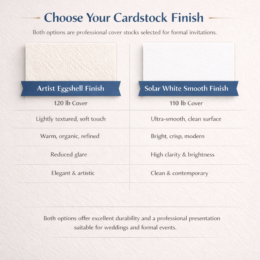 Choose the cardstock finish that best matches the tone and style of your invitation. Both options are high-quality cover stocks commonly used for professional stationery and formal invitations.