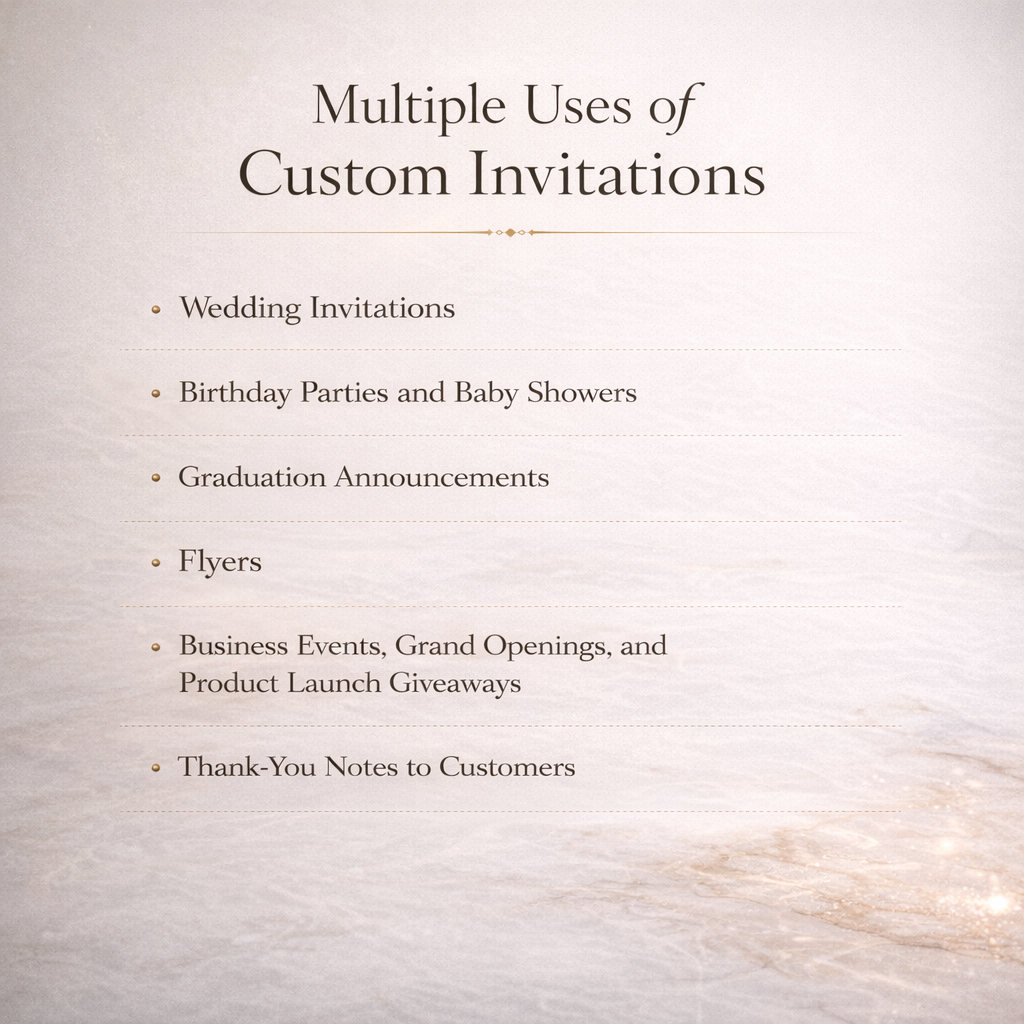 Set the tone for your special event with custom printed invitations that reflect your unique style. Printed on premium cardstock with rich, professional finishes, these invitations are perfect for weddings, birthdays, graduations, business events, or any celebration that deserves a personal touch.