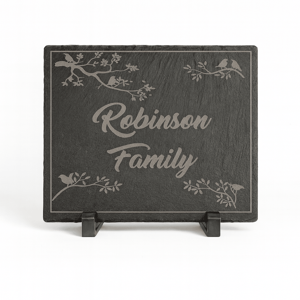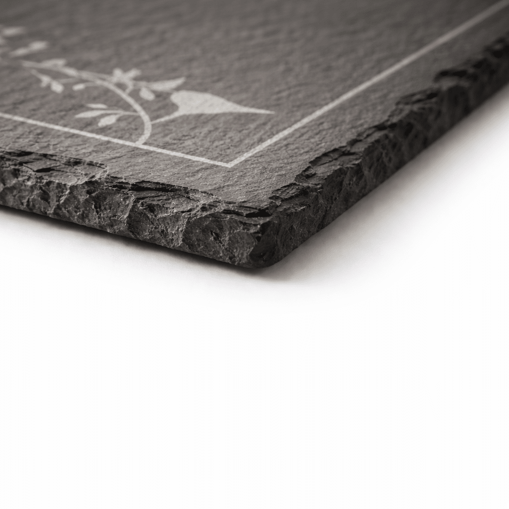 Bring rustic charm and modern elegance together with our engraved slate boards. Made from real stone with naturally chipped edges, each board is unique in character and texture. Custom laser engraving produces a light gray contrast against the dark charcoal surface, making your design stand out beautifully.