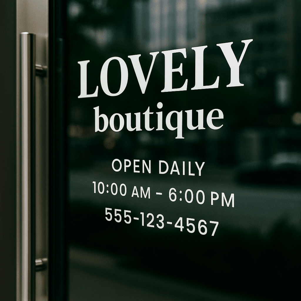 Showcase your brand or message with custom cut vinyl window and door lettering made for long-term visibility. Produced using Oracal 651, a professional-grade vinyl trusted for permanent signage, these graphics are ideal for storefronts, offices, and entryways. Your design can be installed outside the glass or mirrored for inside-glass application (readable from the outside), giving you flexibility based on your space and preferences.